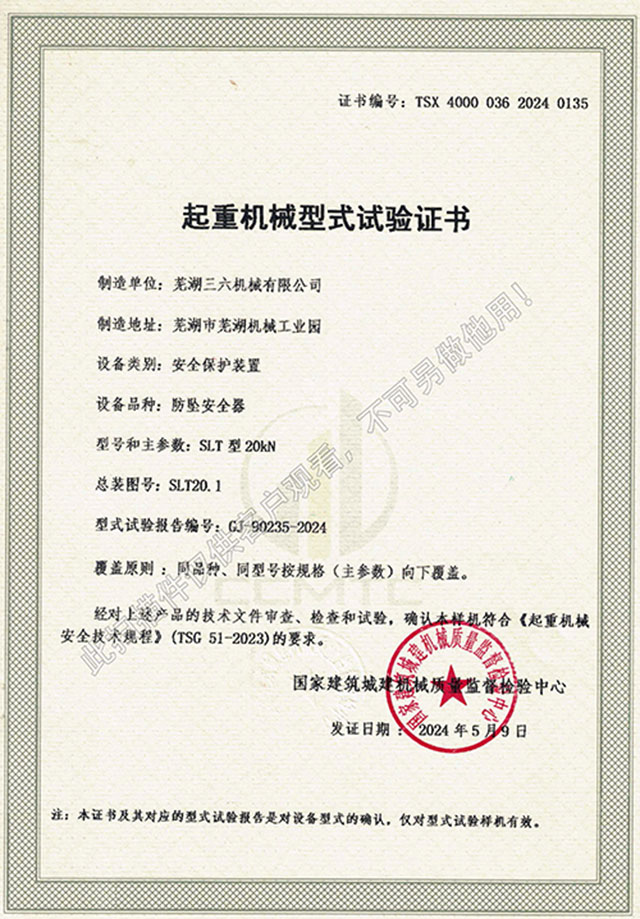 SLT型20kN防墜器型式試驗(yàn)證書(shū)